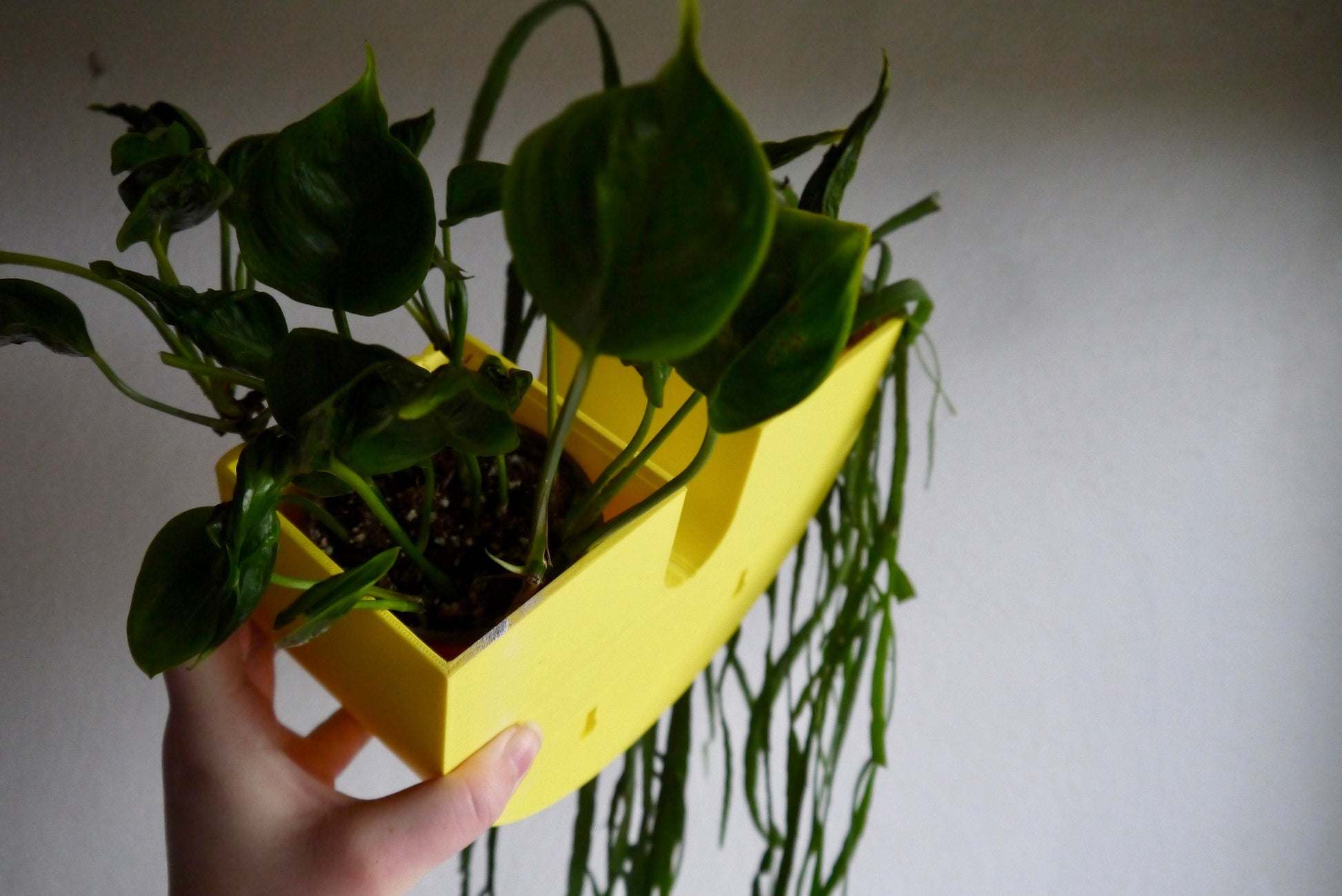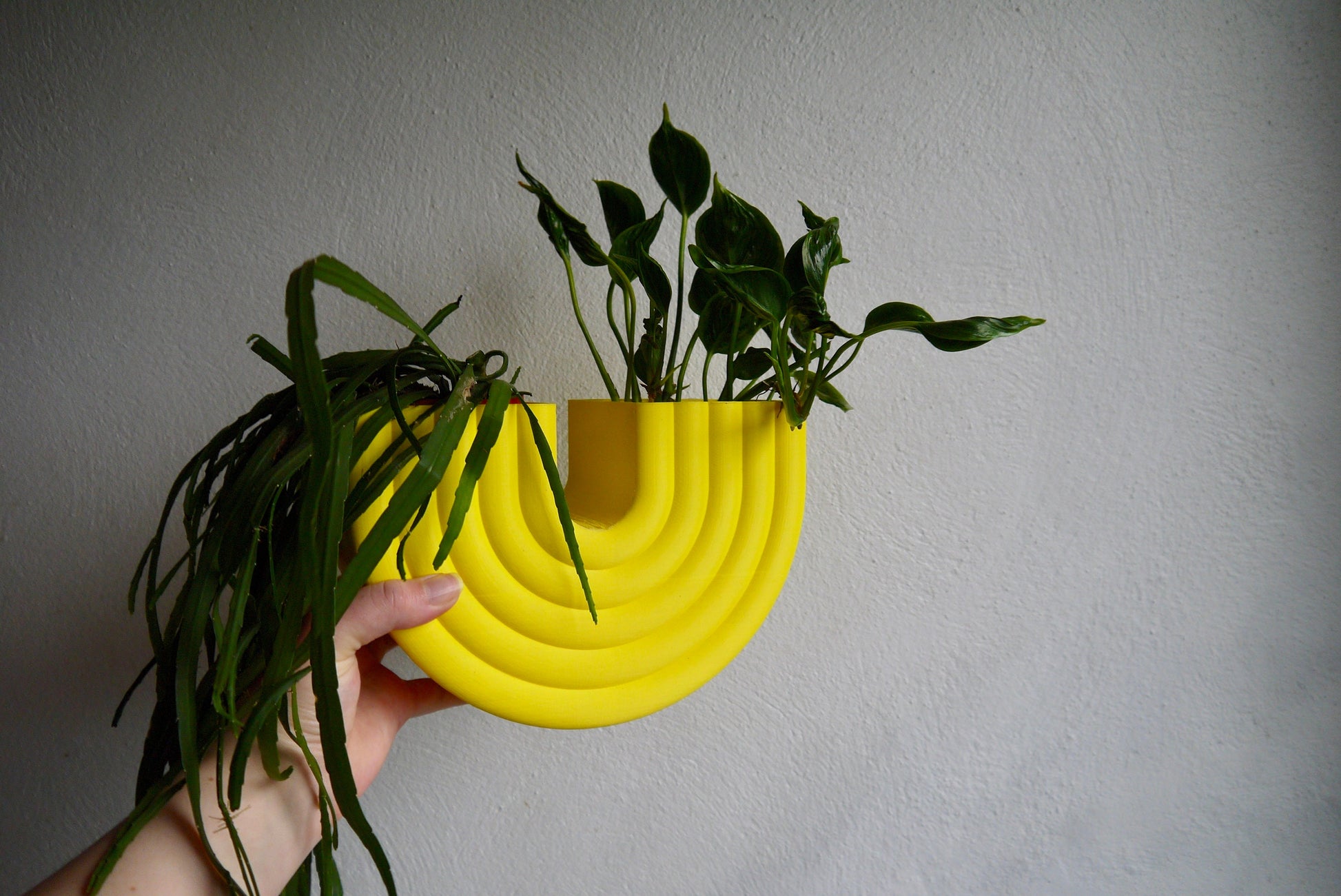 Double wall mounted plant holder made from plant based plastic. Holds two plants and has a fun rainbow shaped design.
